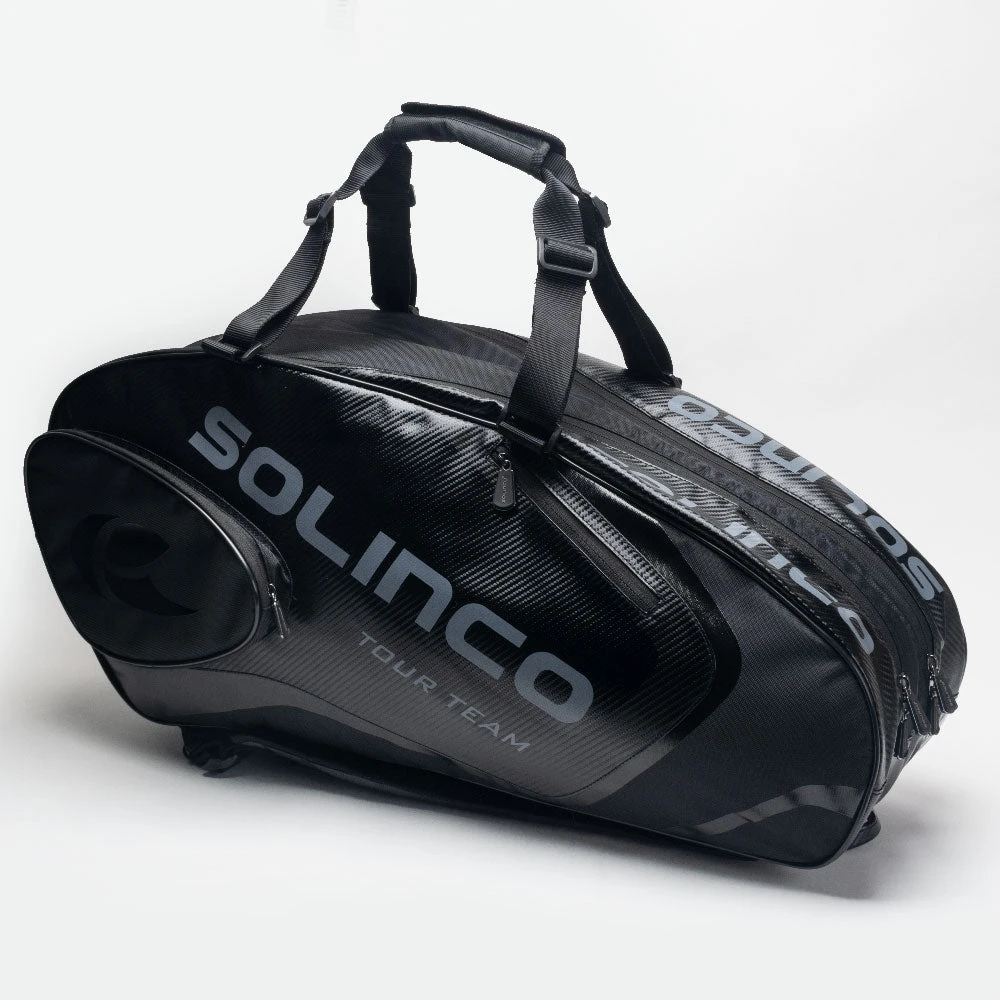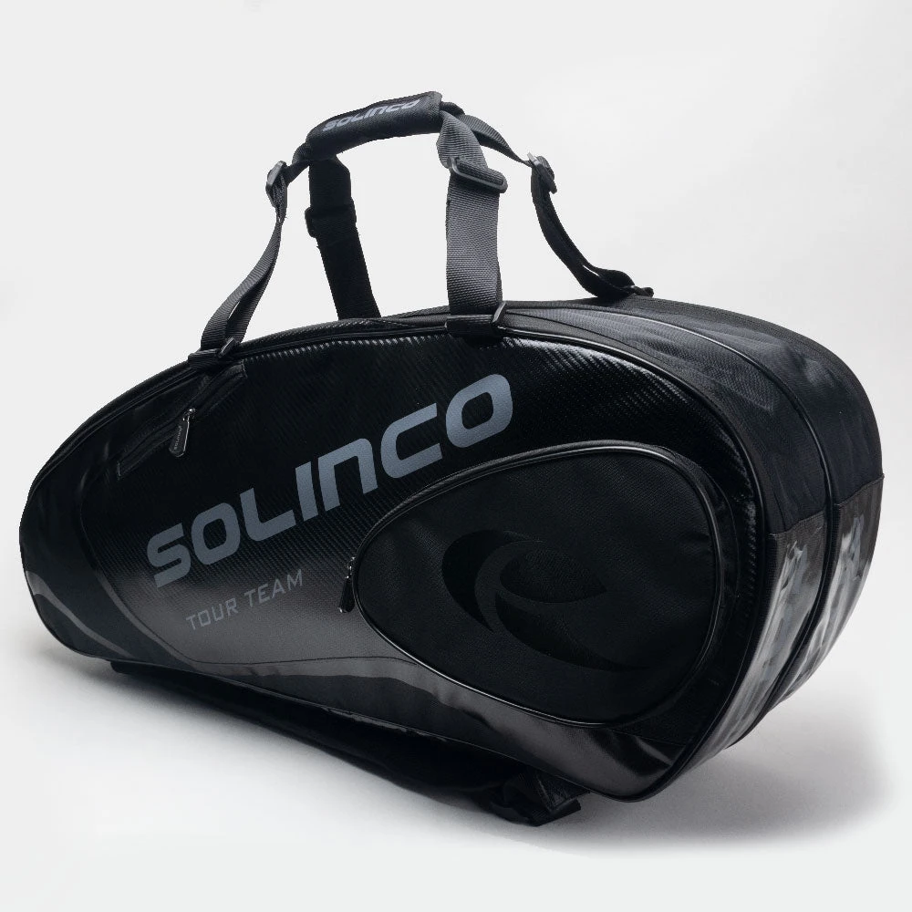 Find a home for all your gear in the Solinco Blackout 6 Pack Bag! Featuring two compartments and one with thermal lining, this tennis bag keeps your racquets safe from extreme temperatures. An additional compartment offers space for more racquets and gear. Two accessory pockets on each side provide versatile storage of large or small items. Finally, the padded adjustable backpack straps let you carry the bag comfortably to the court.