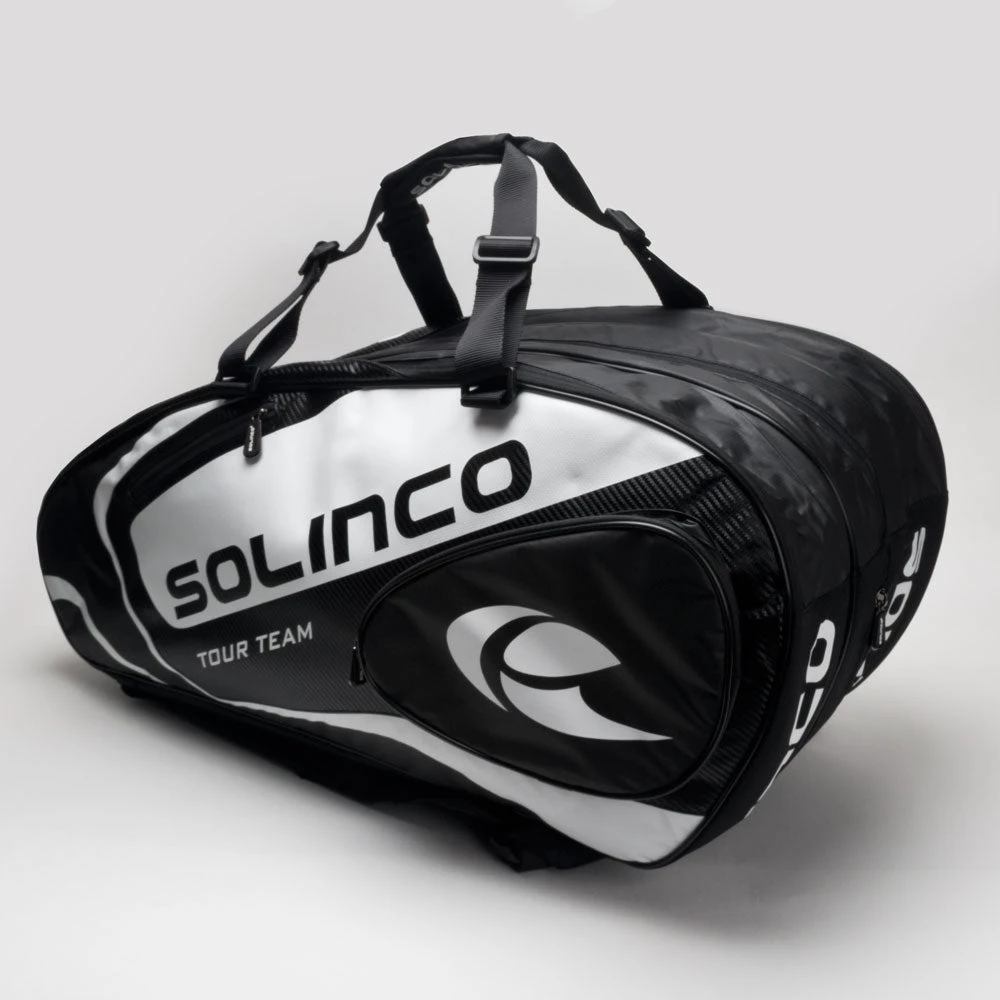 The Solinco Tour 15-Pack Black tennis bag offers ample space for up to 15 tennis racquets. Three large main compartments organize your essentials, with two outside sections protect against extreme temperatures. Professional and amateur tennis players will appreciate the durable material on bold Solinco logos on this vibrant tennis bag.