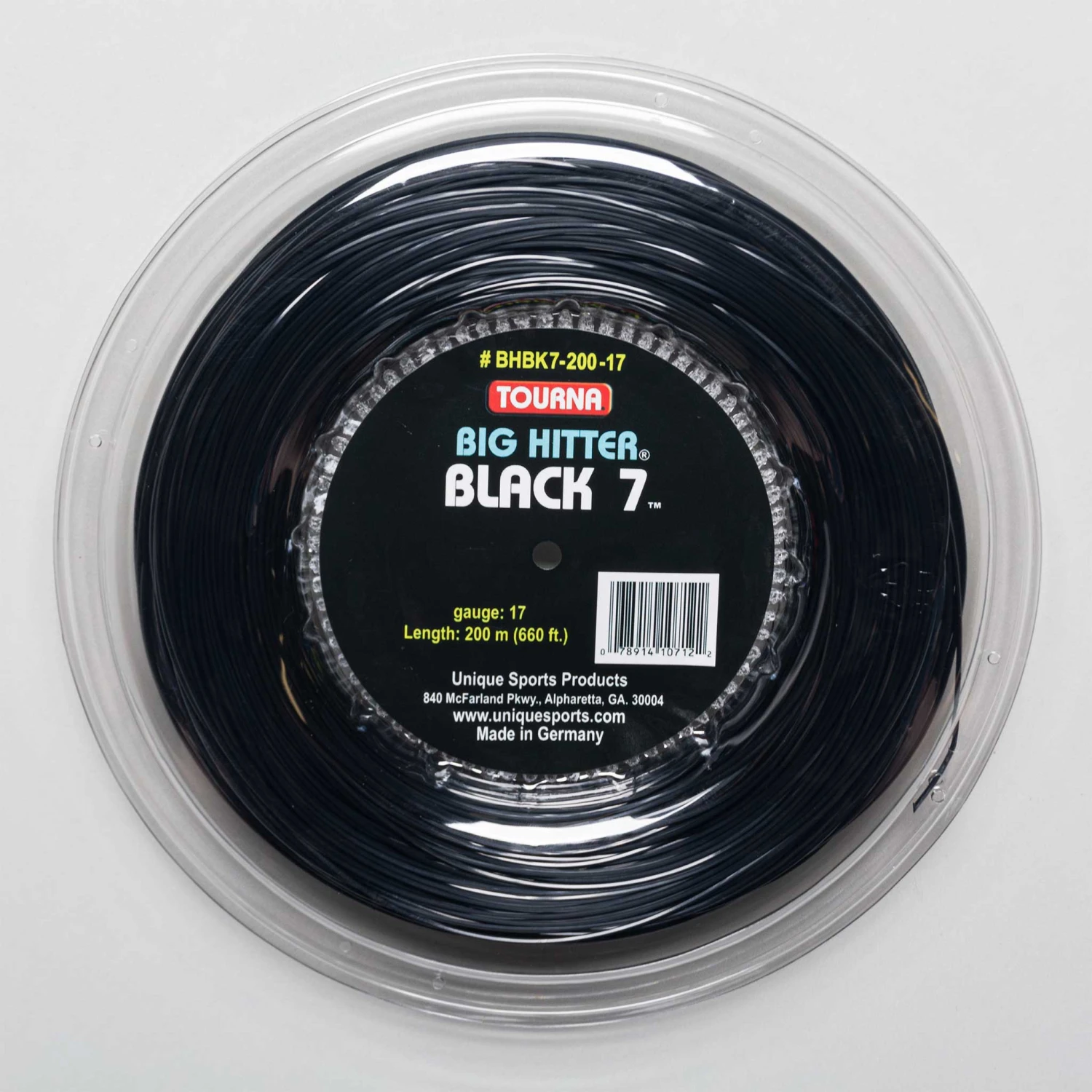 Polyester. Providing control and outstanding spin potential with seven sharp edges that bite into the ball, Big Hitter Black 7 is a great choice for strong players looking for maximum spin potential with excellent control and tension maintenance. Specially blended polyester and polyether materials are able to hold tension better than standard polyester strings. This polyester is ideal for persistent string smashers who crave more control and spin potential.