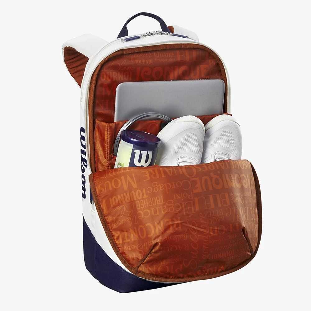 The Wilson Roland Garros Super Tour Backpack is inspired by the colors, design elegance and traditions of the biggest clay court tournament in the world. It includes a partial racquet compartment, a padded laptop sleeve and a ventilated pocket for sweaty clothing. Stash a water bottle in the thermo-regulated pocket on the side, and it will stay cool through match point.
