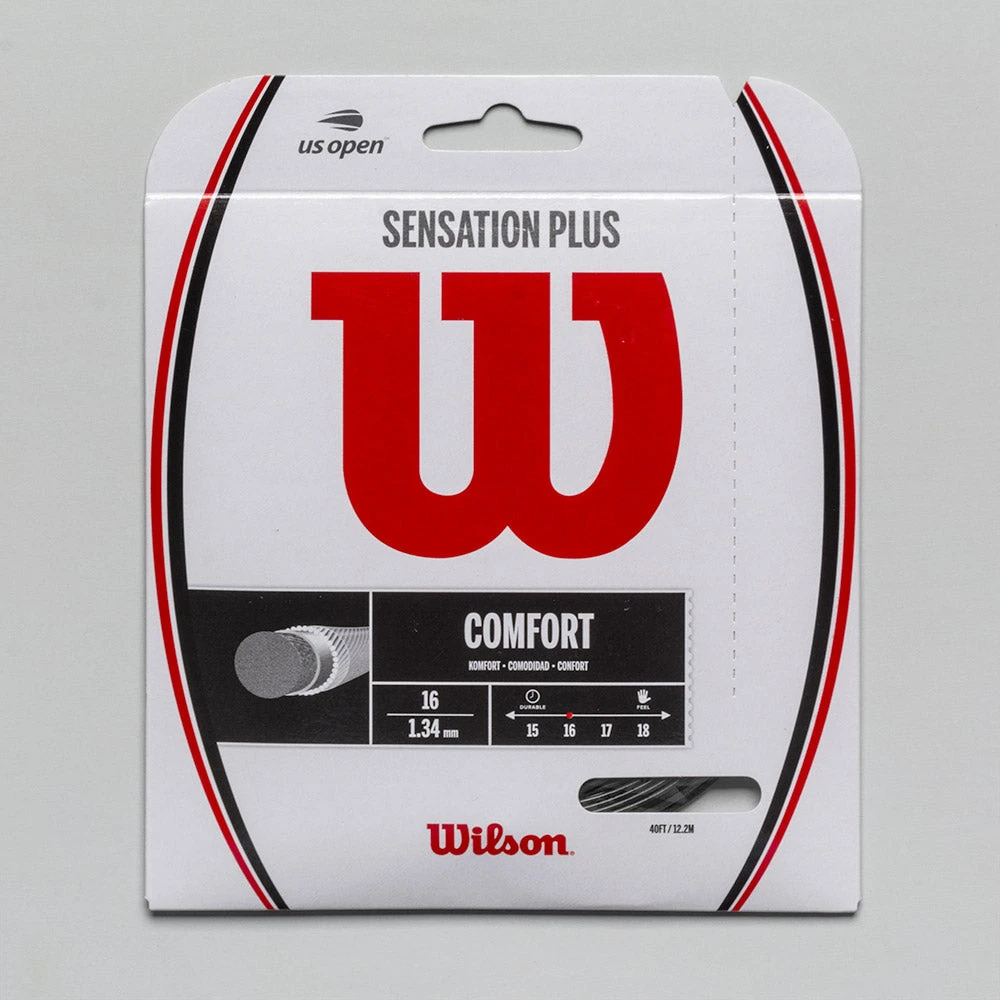 The new Wilson Sensation Plus 16 tennis string is an update to the original Sensation string. This new string helps players achieve even better control from the addition of outer metallic ribbons to an elastic nylon core.