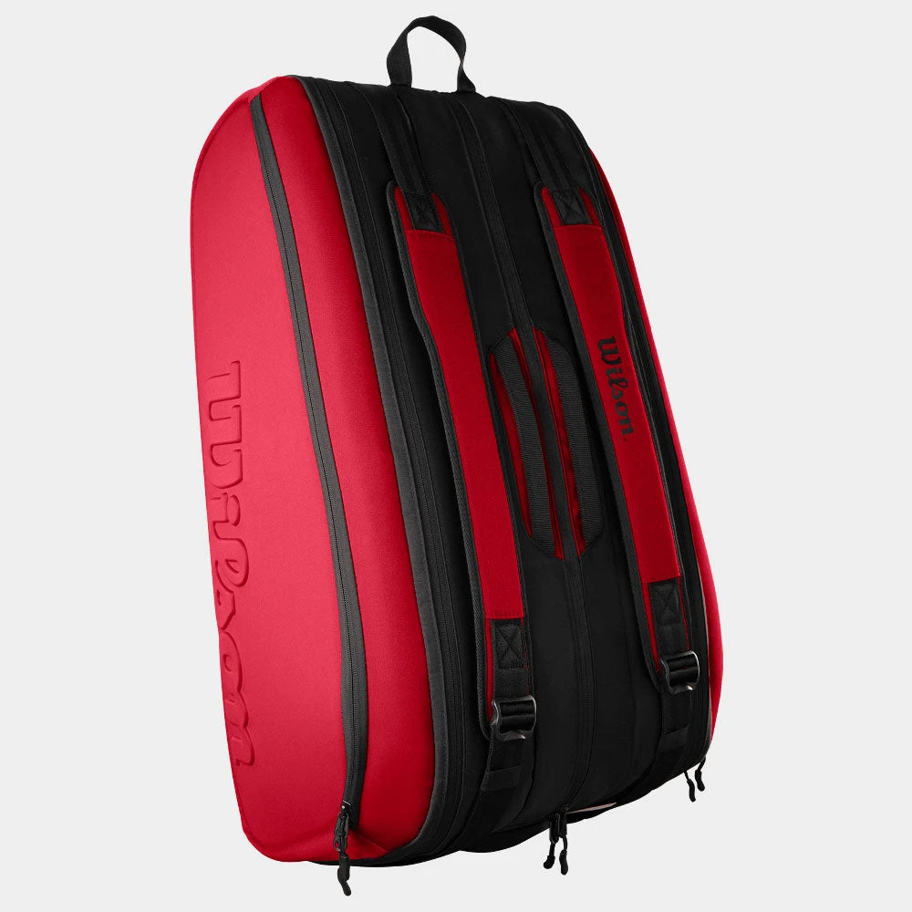 The Wilson Super Tour 15 Pack Clash v2 holds up to 15 tennis rackets across three main compartments for tennis equipment, including two lined with Thermoguard to protect against extreme temperatures. Additional features include a pair of large exterior side pockets for extra personal storage, a zippered shoe pocket with ventilation for added breathability and a dual carry system for alternative modes of carrying. Comprising a recycled PET polyester shell fabric made from 24 PET bottles, this tennis bag’s innovative design complements the Clash v2 performance racquets with a rich, red hue and embossed Wilson logo.