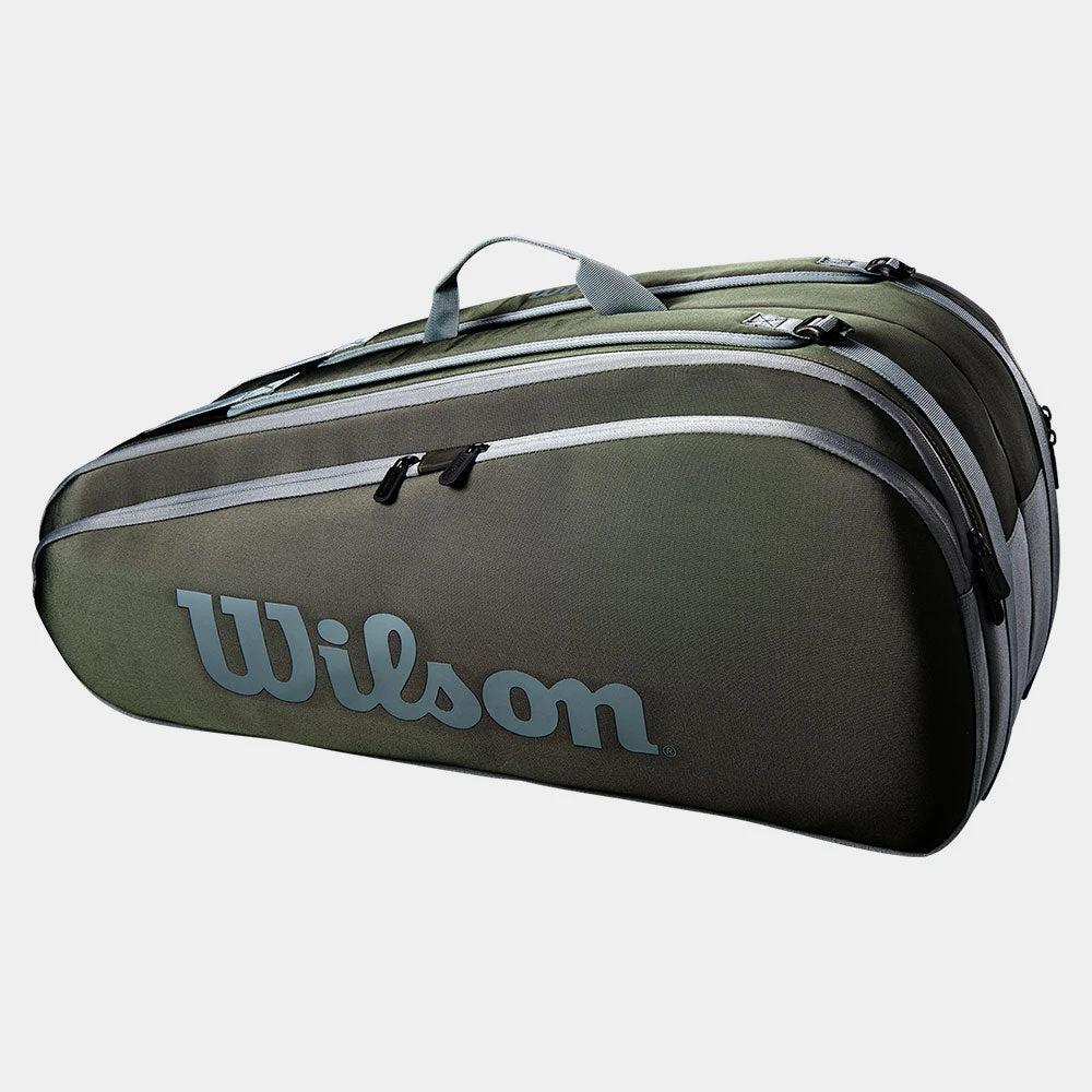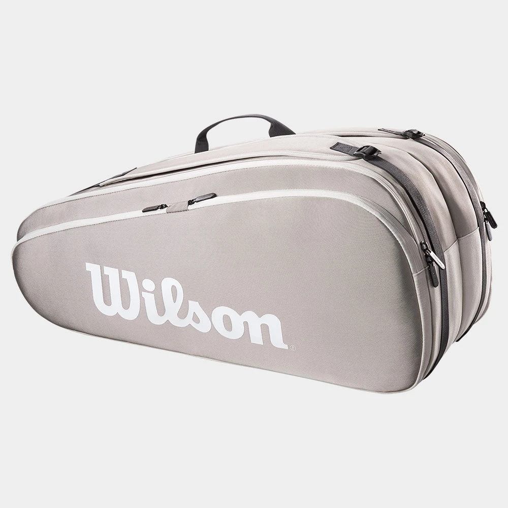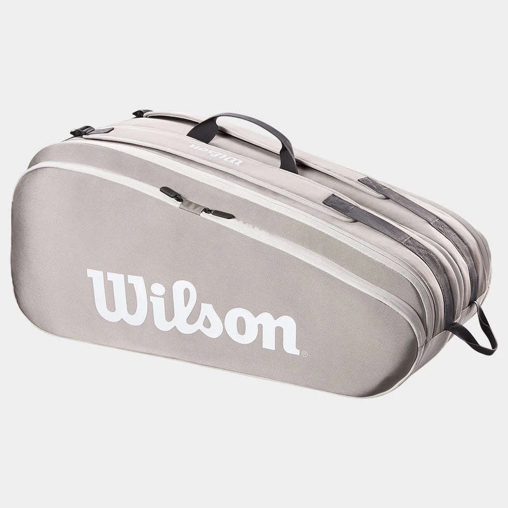 Sporting a fashionable stone color, the Wilson Tour 12 Pack features two separate zip compartments to carry up to 12 racquets and gear. Extra zippered pockets provide space for shoes, accessories and other personal items, while the padded backpack straps make carrying easy and comfortable.